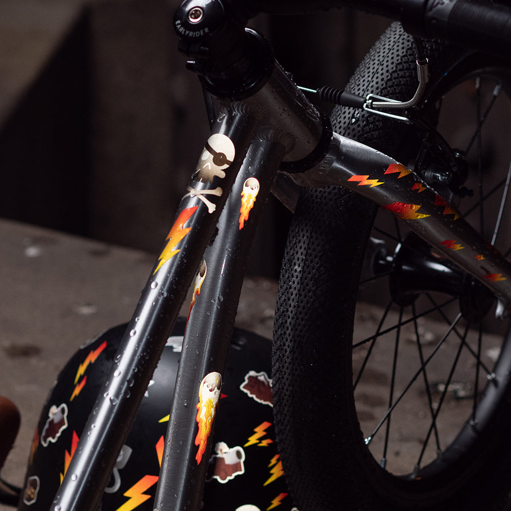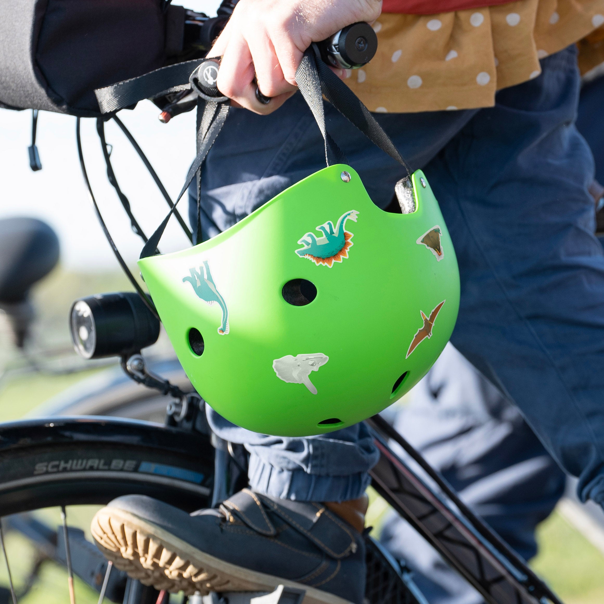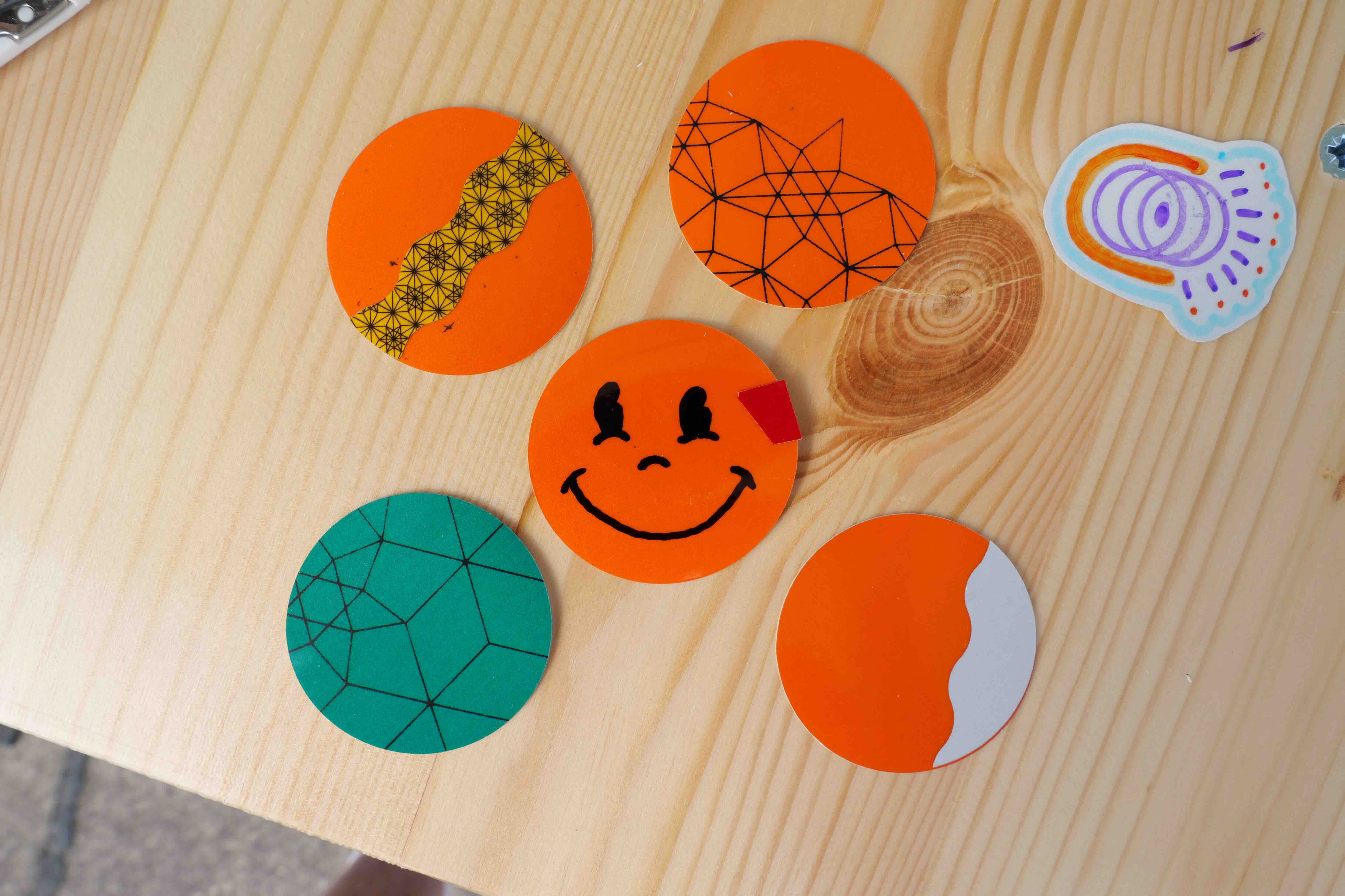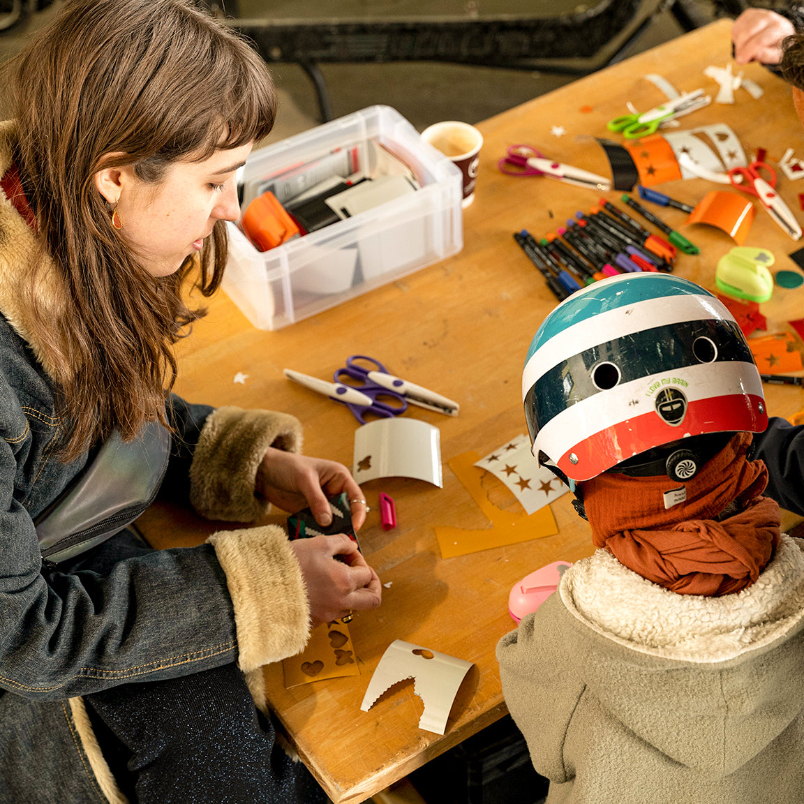 Unter unserer Anleitung und mit Hilfe von raffinierten Werkzeugen kreieren Kids ihre ganz eigenen reflektierenden Sticker, die dann sogleich auf Helm, Fahrrad und Tretroller landen.