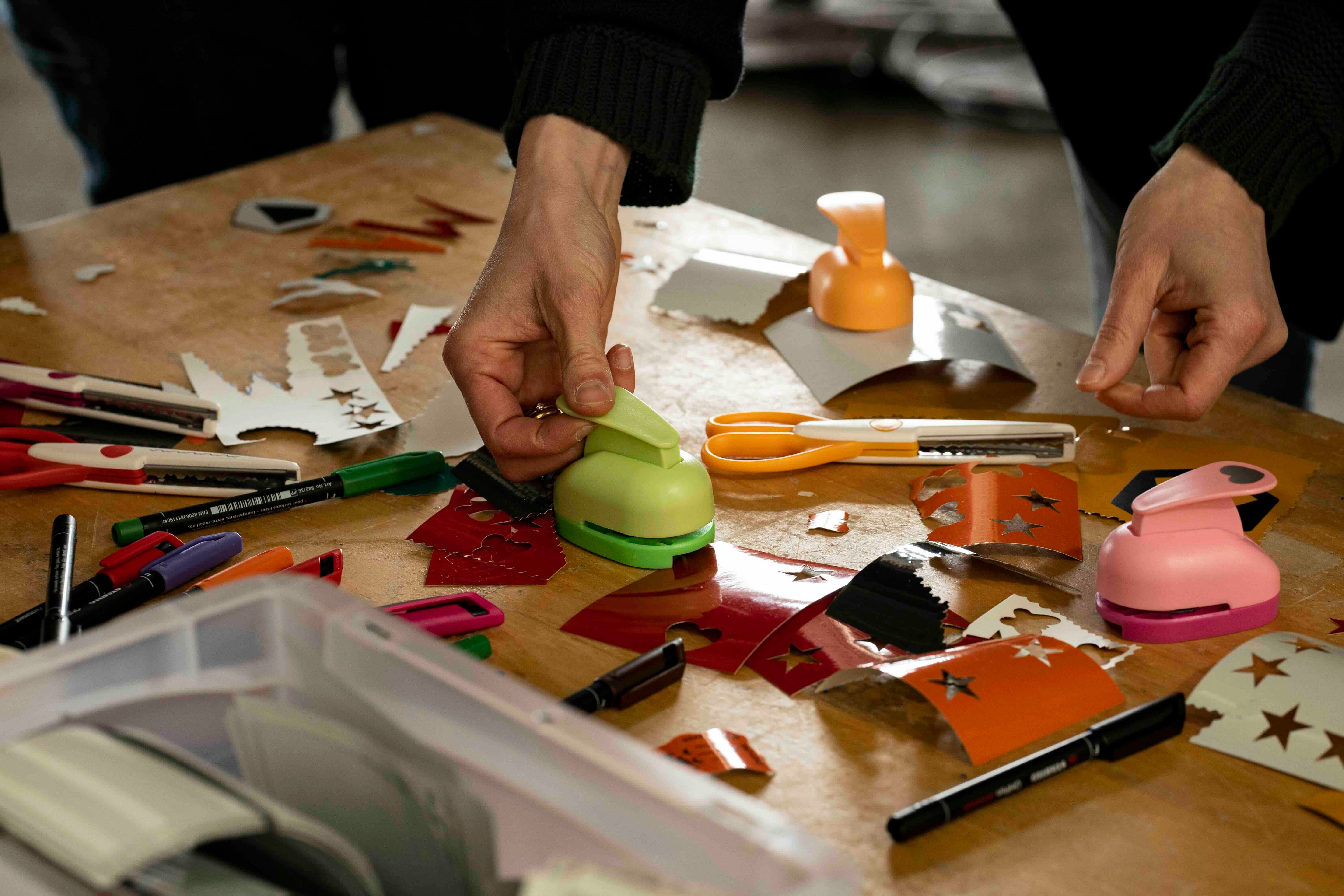 Materialreste und Folienverschnitt aus unserer Produktion werden in Bastelworkshops zu individuellen Reflektoren wiederverwertet.